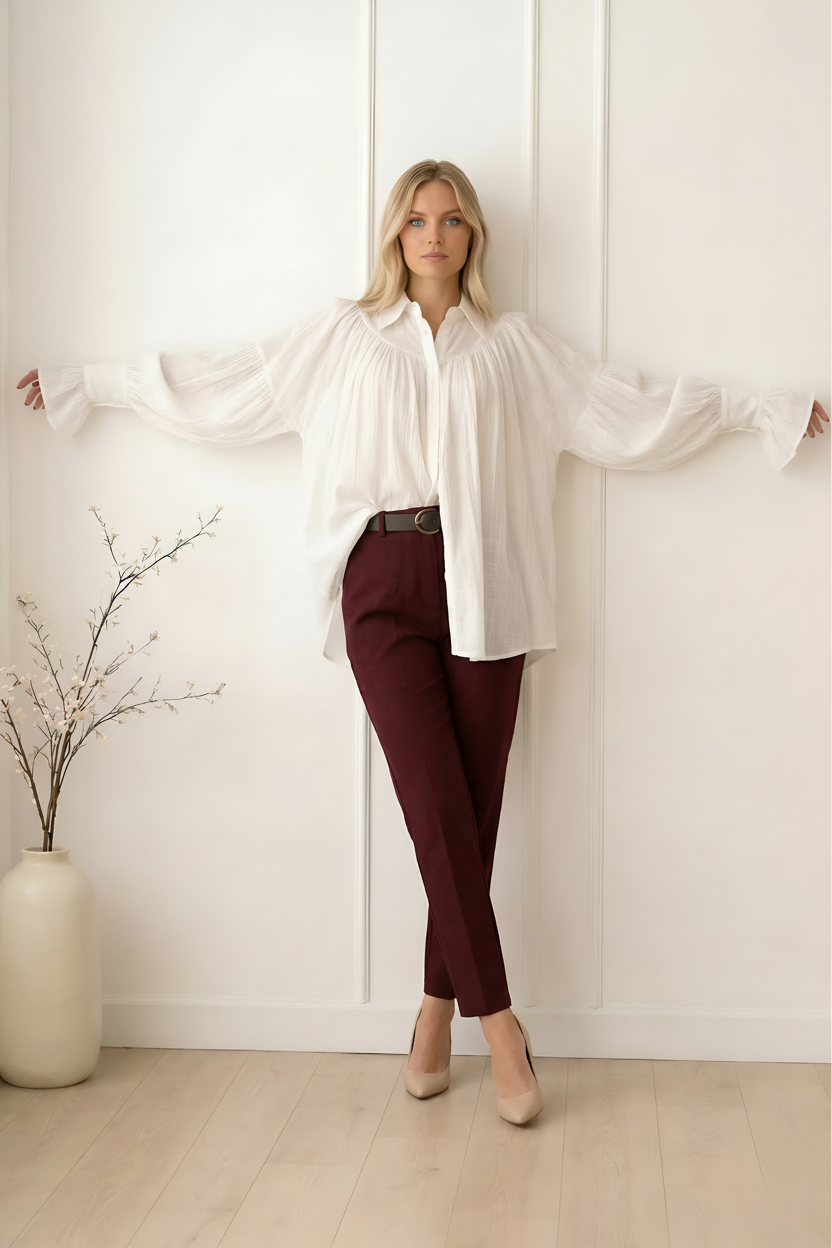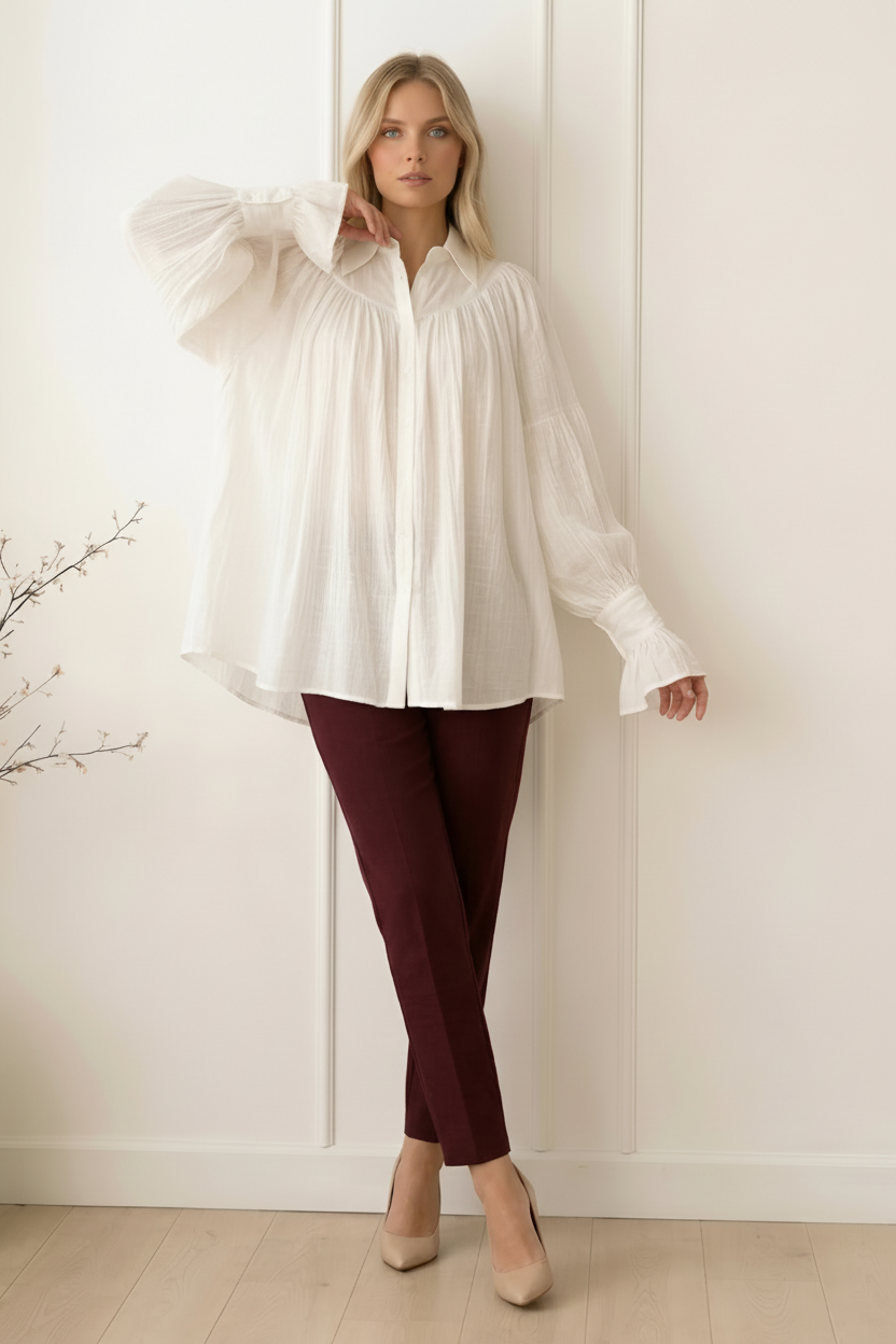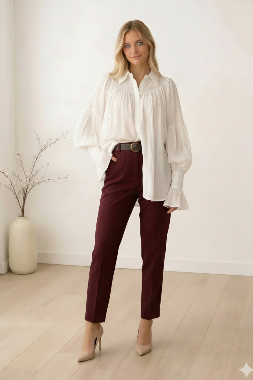 Porada stylisty: Śmietankowa biel uwielbia kontrastowe zestawienia! Aby uzyskać profesjonalny, a jednocześnie modny look, wsuń bluzkę luźno w spodnie o kroju cygaretek w kolorze burgundu lub beżu – to pięknie podkreśli talię i zrównoważy objętość rękawów. Jeśli zależy Ci na bardziej swobodnym efekcie, rozepnij dwa górne guziki i podciągnij mankiety do połowy przedramion, tworząc jeszcze większą, kaskadową bufkę. To prosty trik, który nada całej sylwetce lekkości i nowoczesnego sznytu.