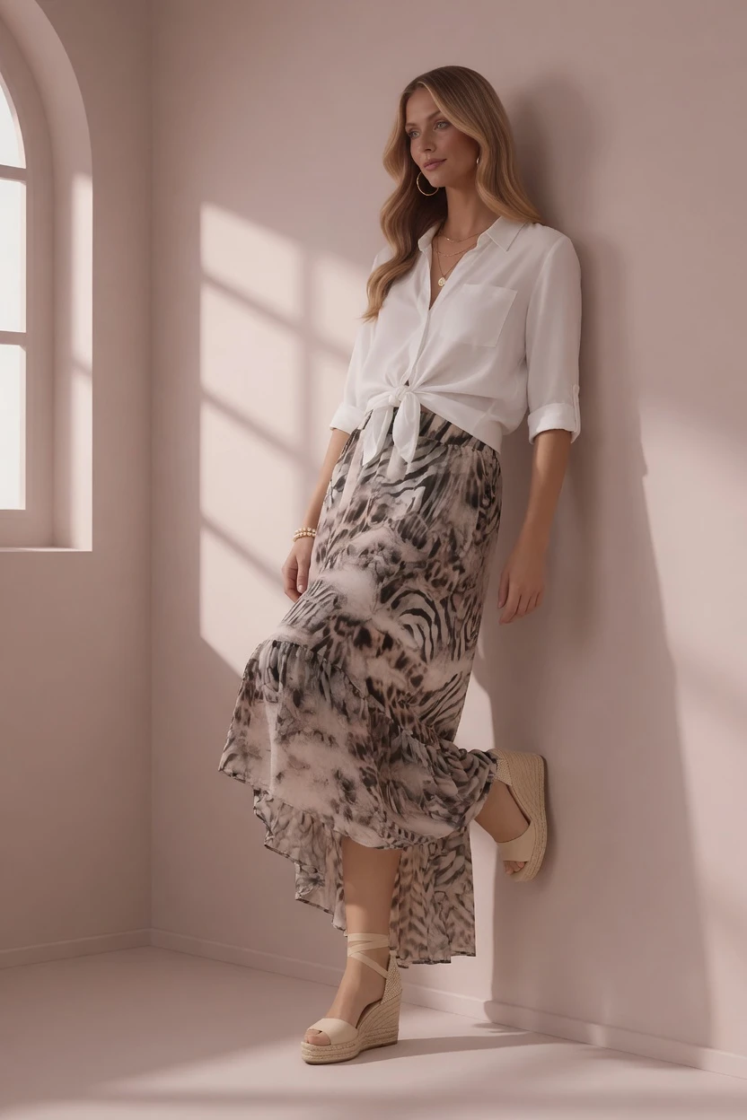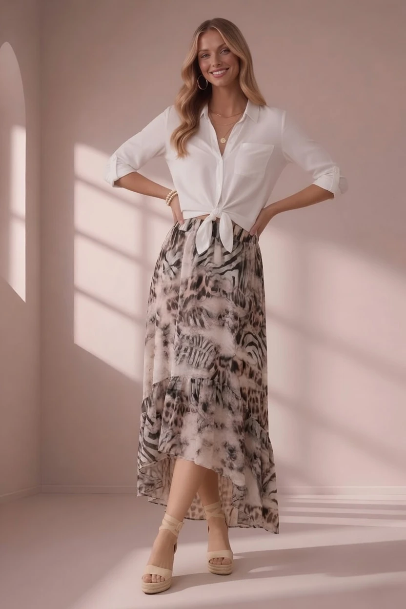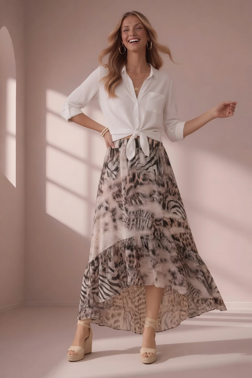 Porada stylisty: Ta spódnica świetnie wygląda w zestawieniu z lekką koszulą zawiązaną w talii – jak na zdjęciu – tworząc modną i kobiecą stylizację. Możesz połączyć ją także z prostym topem i sandałami na koturnie, aby uzyskać idealny letni look. W bardziej eleganckiej wersji zestaw ją z dopasowaną bluzką i szpilkami.