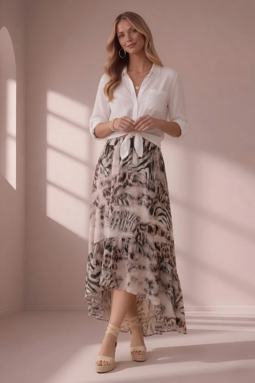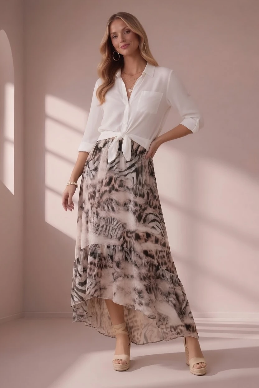 Lekka, kobieca i niezwykle stylowa – ta spódnica midi zachwyca subtelnym wzorem inspirowanym motywami natury i animal printem w eleganckich, neutralnych odcieniach. Wykonana z delikatnego, zwiewnego szyfonu, pięknie układa się na sylwetce i nadaje stylizacji lekkości. Asymetryczny dół sprawia, że spódnica efektownie porusza się podczas chodzenia, tworząc wyjątkowo kobiecy look.
