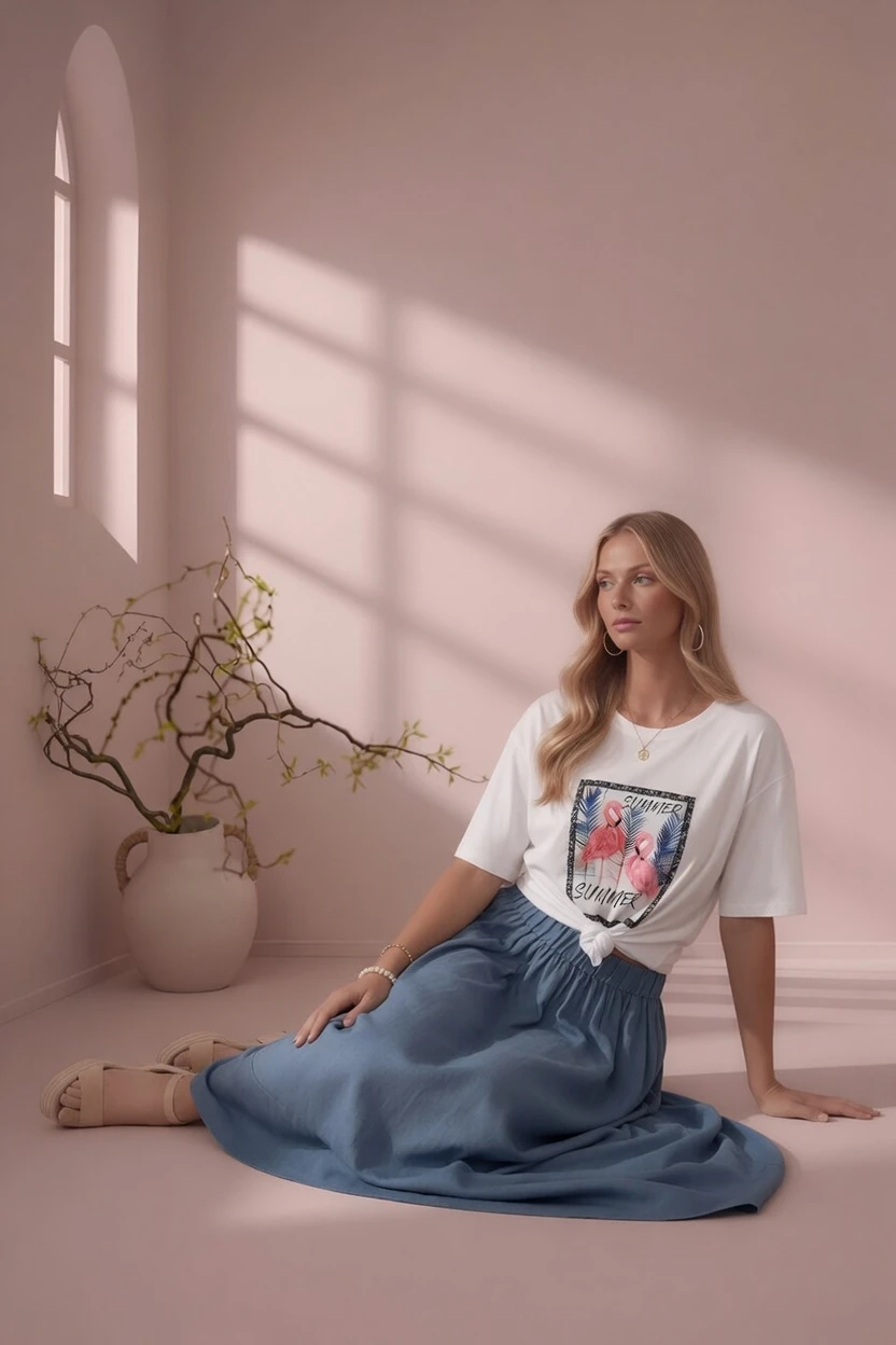 Ta zwiewna, rozkloszowana spódnica to definicja letniego szyku! Uszyta z miękkiego, naturalnego materiału w głębokim odcieniu indygo, pięknie układa się w ruchu i podkreśla talię. Sprawdzi się idealnie zarówno na codzienne wyjścia, jak i letnie uroczystości.