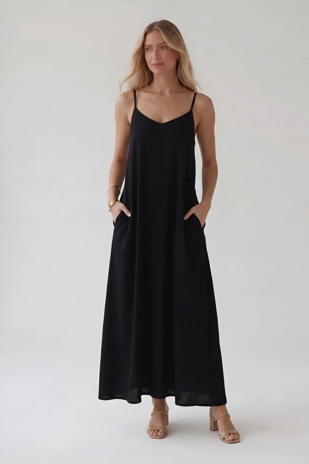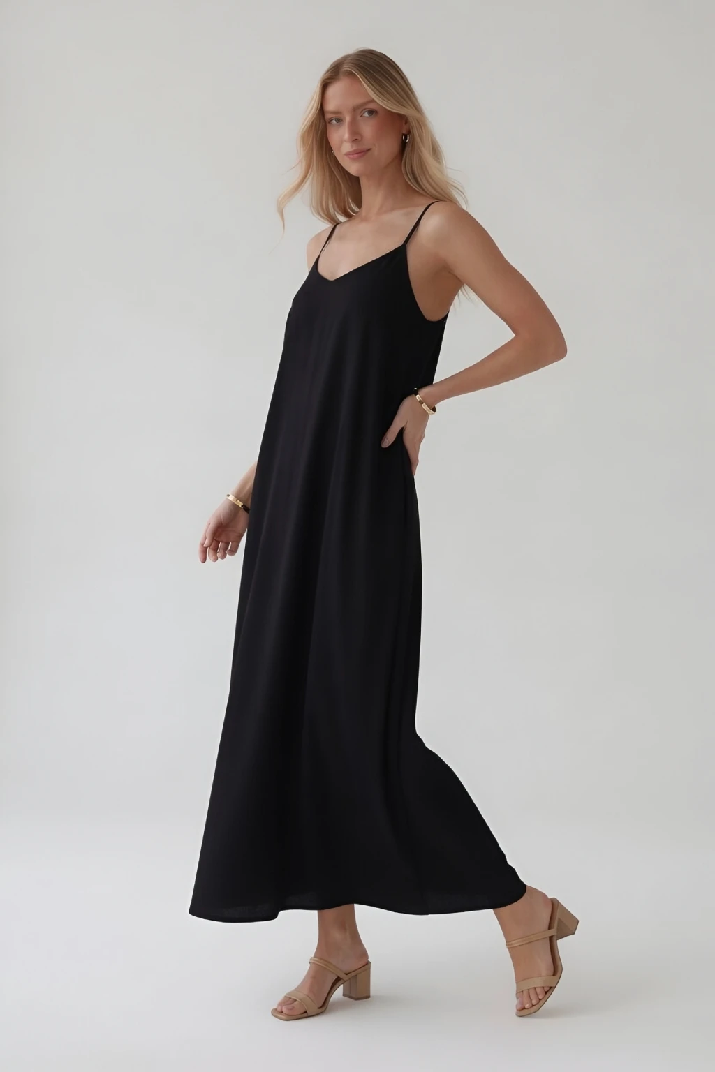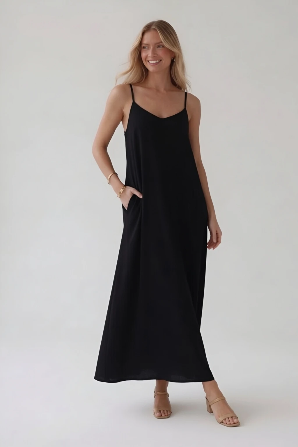 Elegancka sukienka maxi o minimalistycznym kroju, która zachwyca prostotą i ponadczasowym stylem. Model na cienkich ramiączkach z subtelnym dekoltem w serek pięknie podkreśla linię ramion i szyi. Swobodny, lekko rozkloszowany fason sprawia, że sukienka doskonale układa się na sylwetce i zapewnia komfort noszenia.
