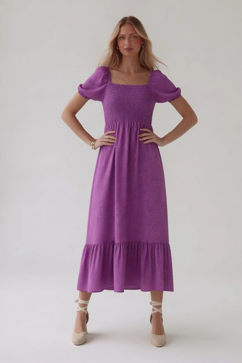 Kobieca sukienka midi w delikatny wzór kropek, która zachwyca romantycznym stylem i komfortowym fasonem. Model z elastyczną górą typu smocking pięknie dopasowuje się do sylwetki, podkreślając talię i biust. Rozkloszowany dół z falbaną nadaje stylizacji lekkości i sprawia, że sukienka efektownie układa się podczas ruchu.