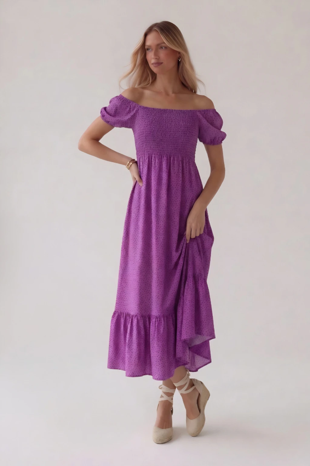 Sukienka damska midi w kropki – fioletowa