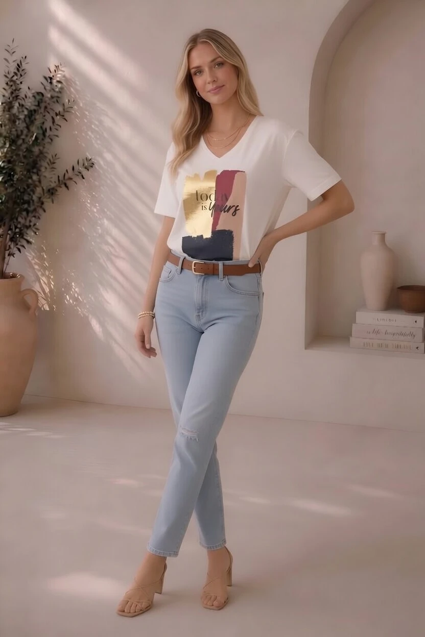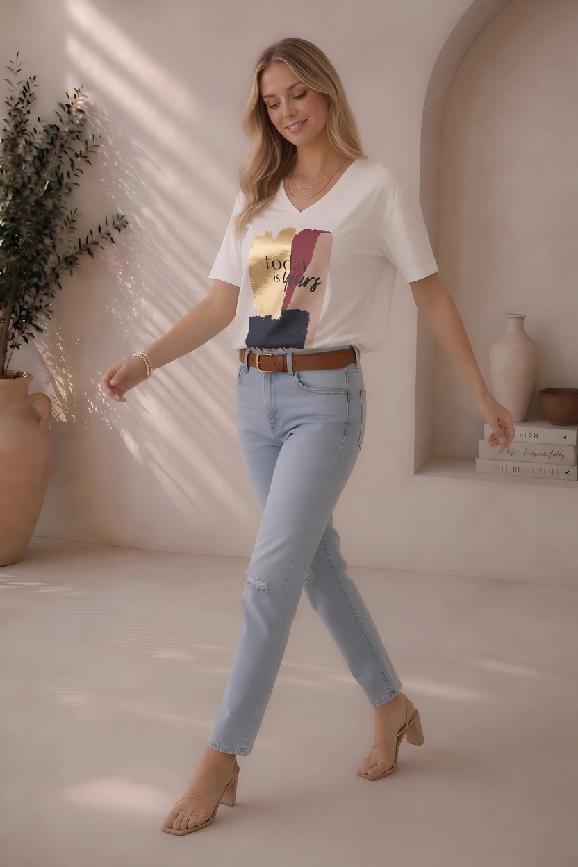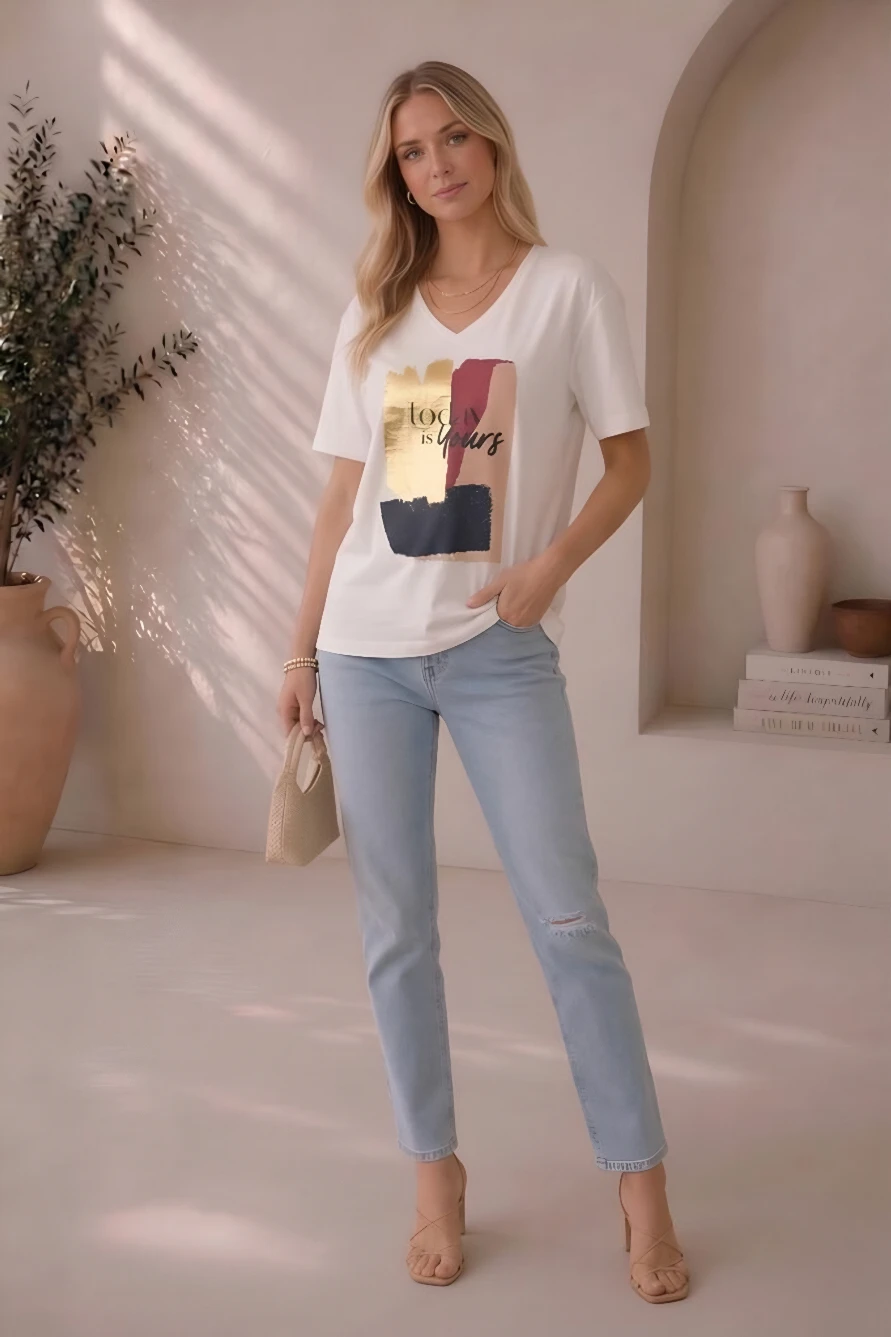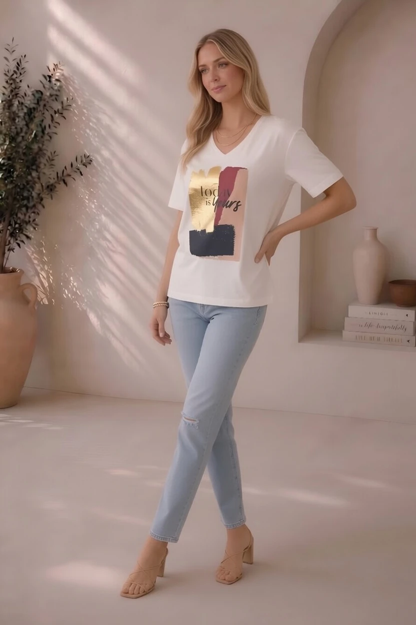 Modny t-shirt z efektownym nadrukiem w nowoczesnym stylu, który przyciąga uwagę i nadaje stylizacji wyjątkowego charakteru. Model o swobodnym kroju z dekoltem w serek świetnie układa się na sylwetce i sprawdzi się w codziennych stylizacjach. Kolorowy nadruk z napisem „Today is yours” dodaje koszulce modnego, miejskiego akcentu.