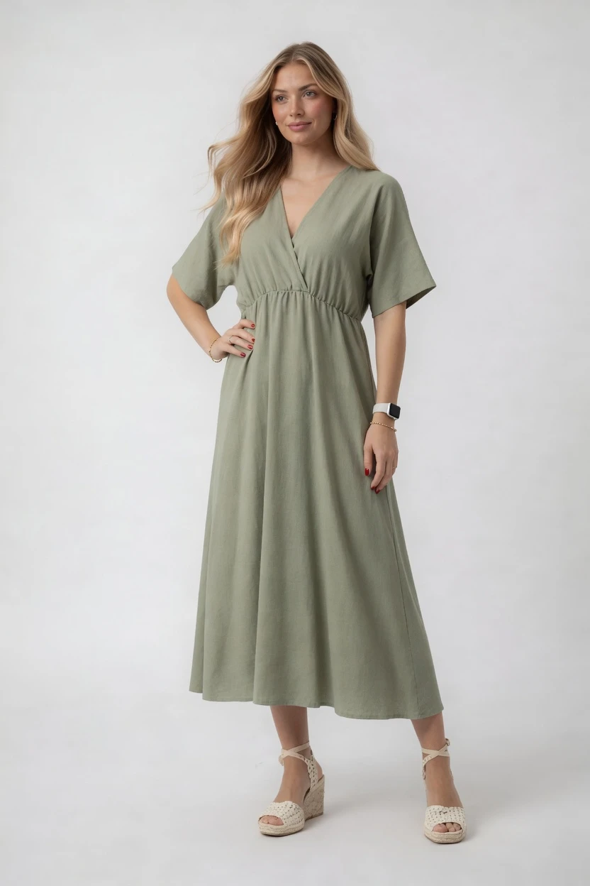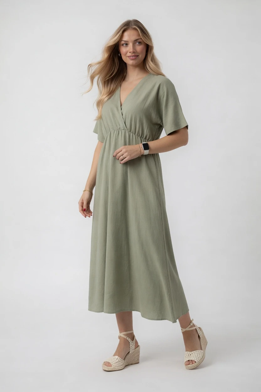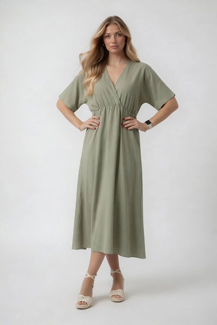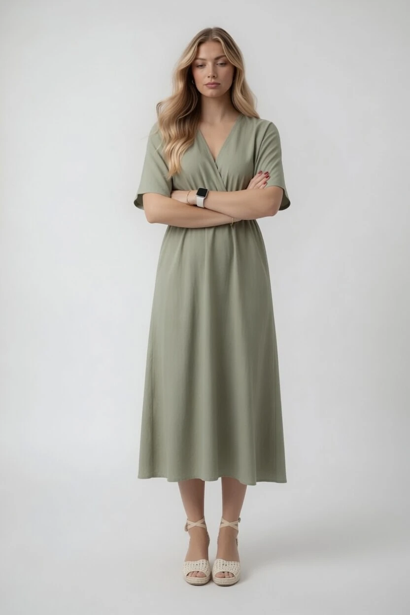 Sukienka midi z kopertowym dekoltem – oliwkowa
